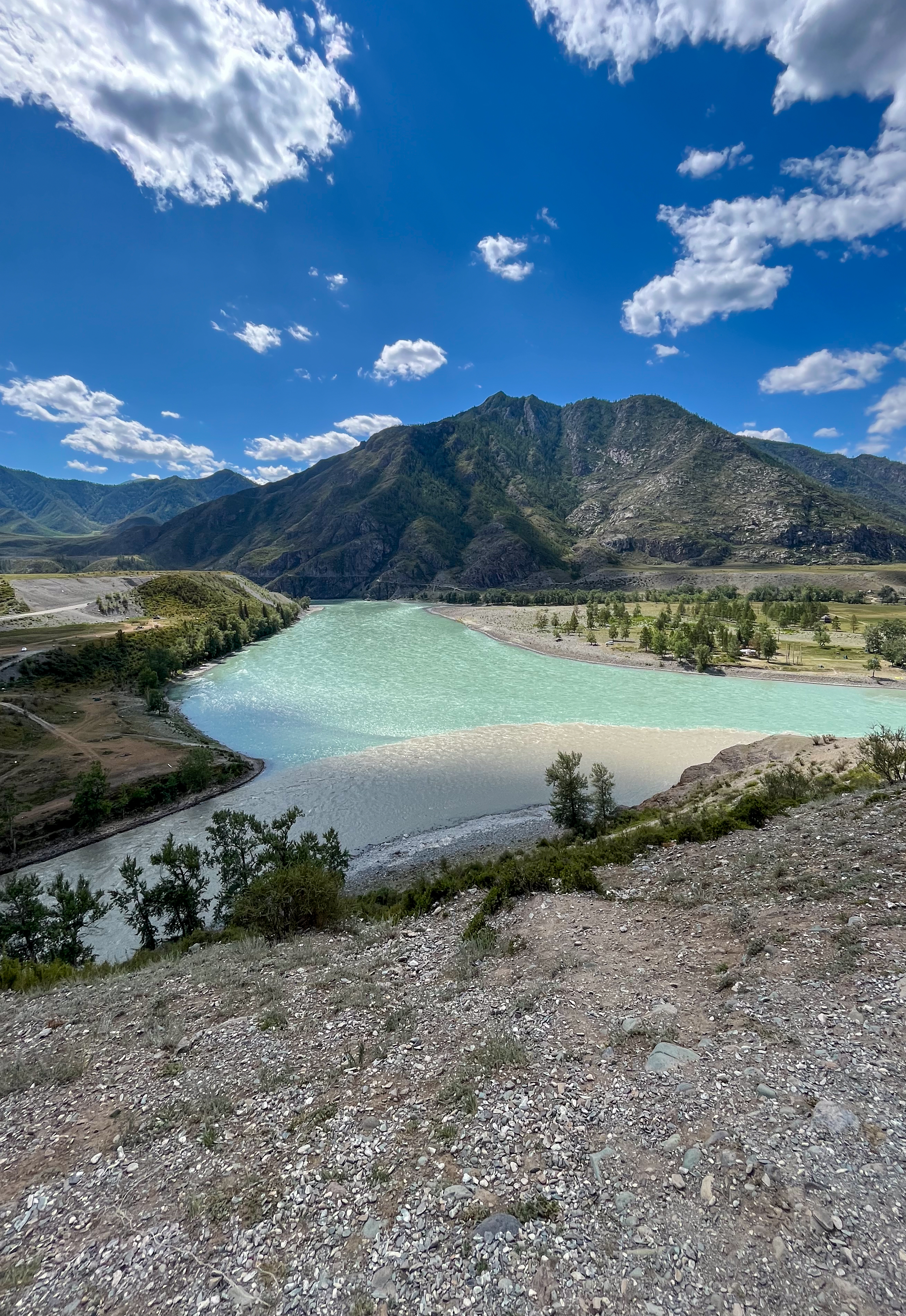 Слияние рек Чуя и Катунь. У рек разные цвета — и в солнечный полдень это хорошо видно.
