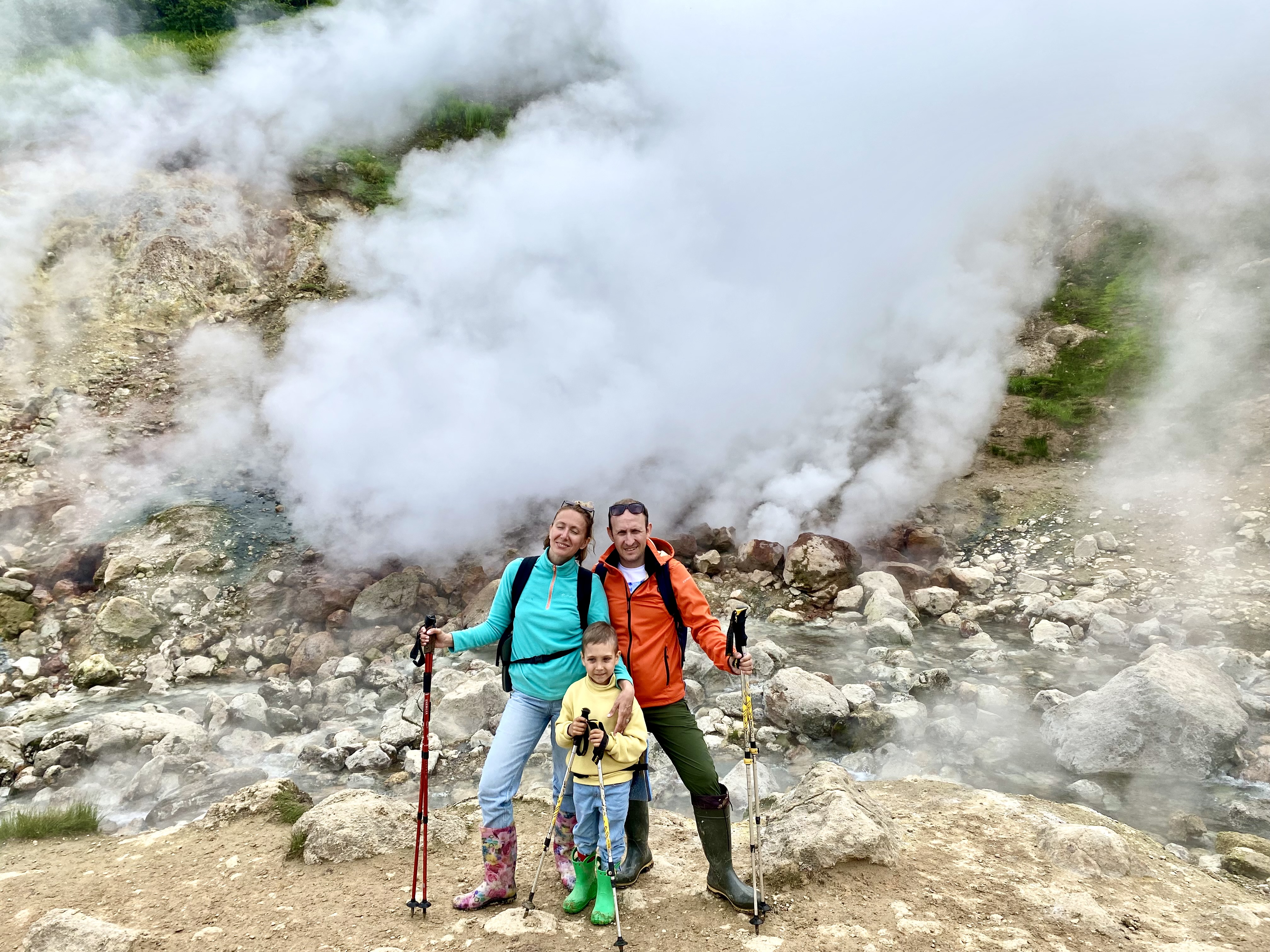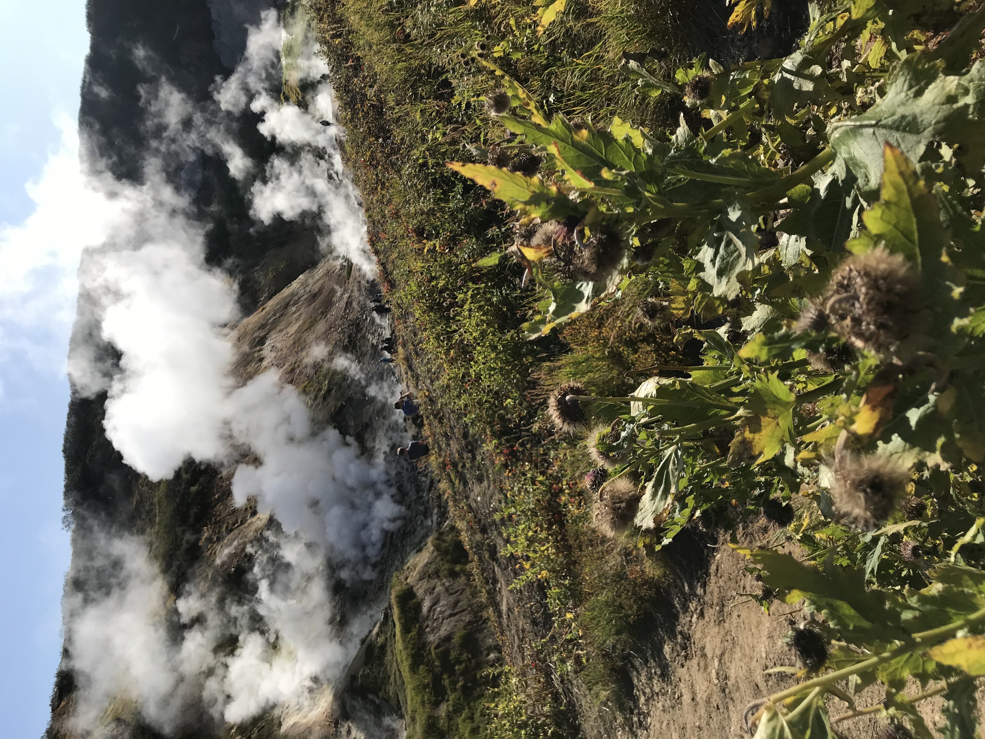 - И, наконец, доберёмся до фумарольных полей Дачные источники, в народе называемых мини-долиной гейзеров. Посетим поля Медвежье, Утиное и самое большое и активное поле, где с оглушительным рёвом на поверхность выходят струи перегретой парогазовой смеси. Вы увидите грязевые котлы, термофильные растения, пышущую жаром землю — и запомните это зрелище навсегда!