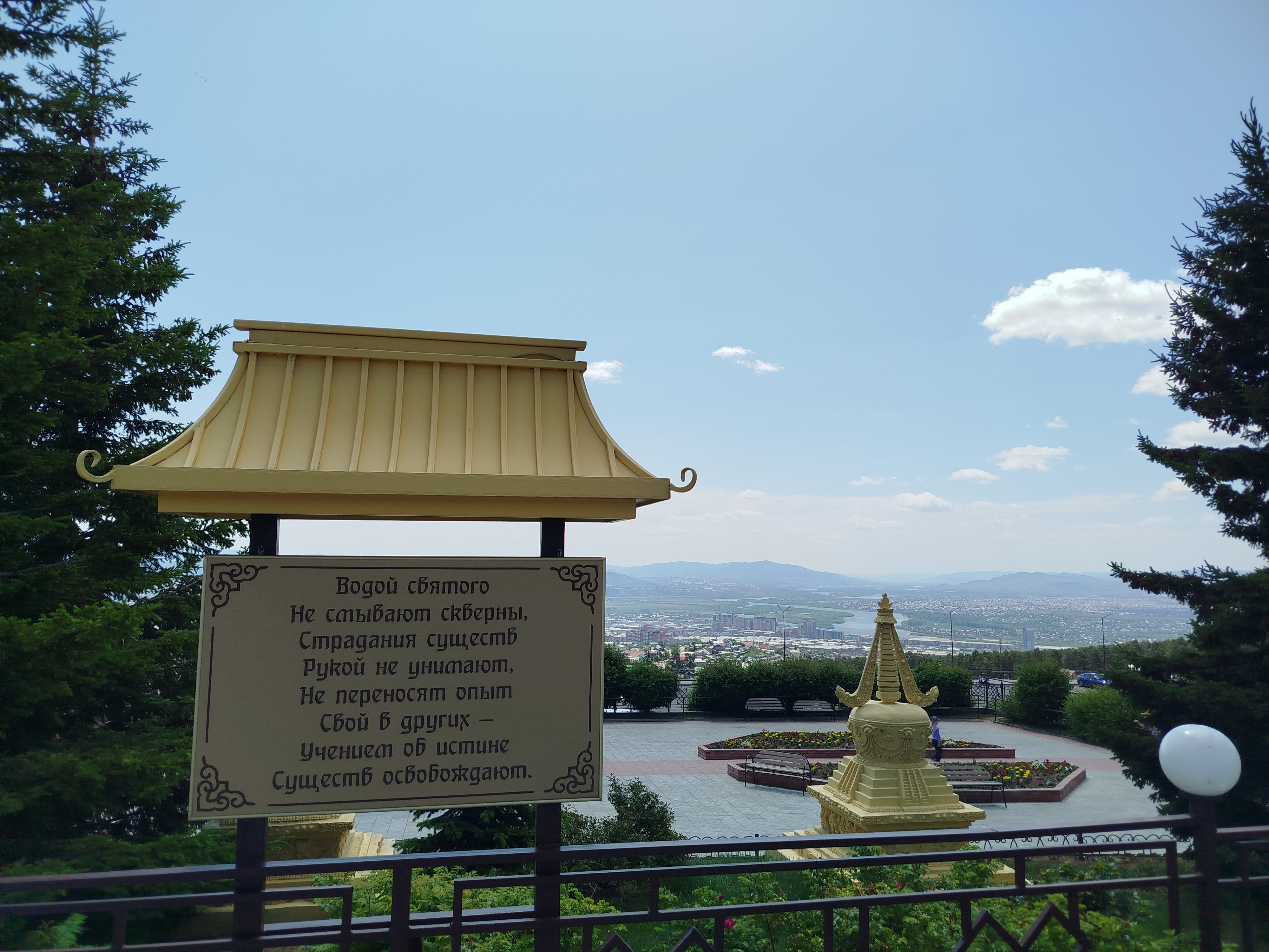 - После мы отправимся на панорамную площадку с видом на весь Улан-Удэ и разделяющую город реку Селенгу (главный приток воды Байкала), на Лысой горе. Здесь же вы посетите дацан «Ринпоче Багша»: это самый красивый дацан города Улан-Удэ и место, которое просто необходимо посетить каждому гостю бурятской столицы! Вы увидите крупнейший буддийский колокол и загадаете желание у самых больших молитвенных четок в России