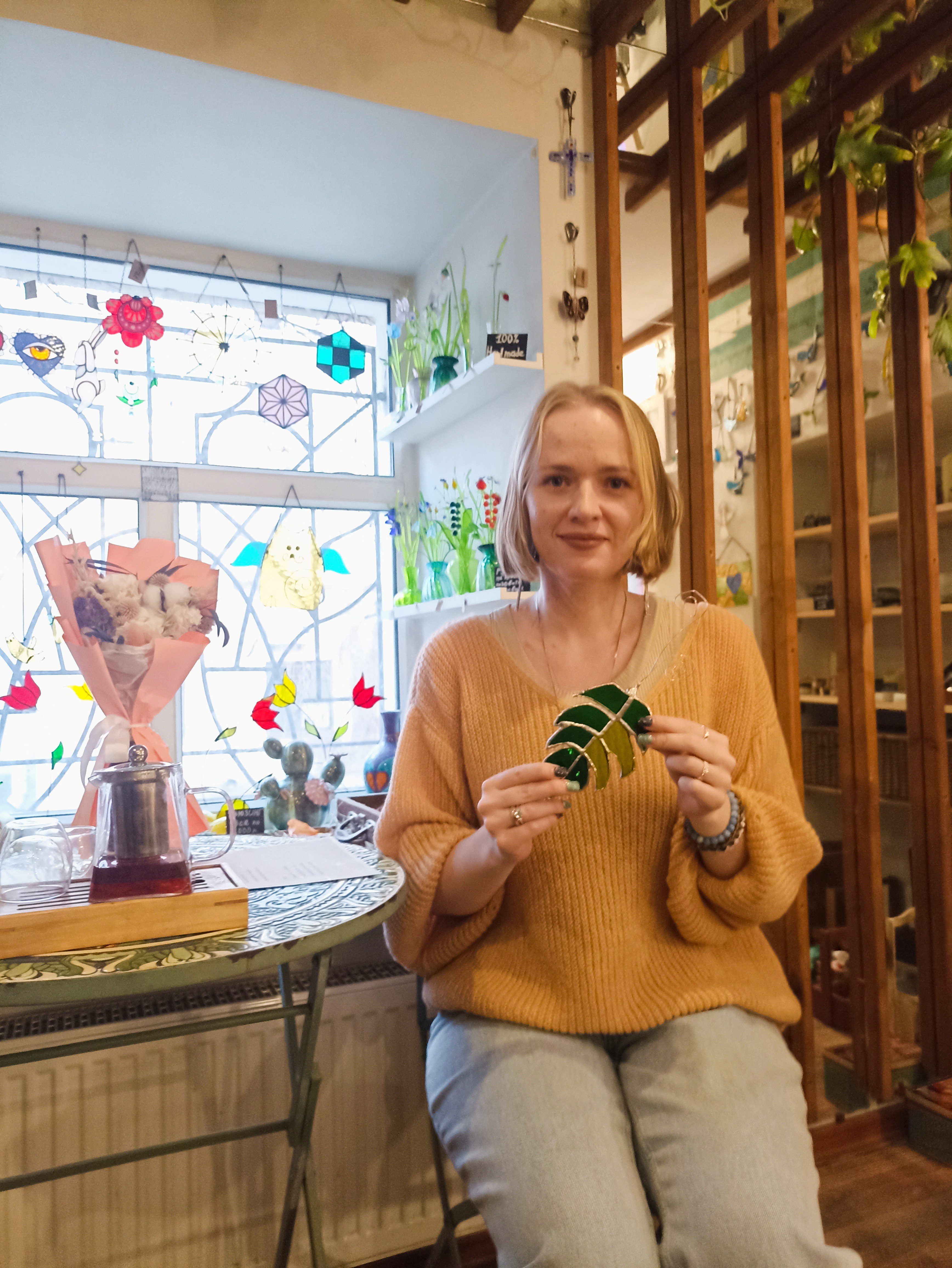 Под руководством опытного художника вы своими руками создадите изделие на выбор — монстеру, пёрышко или синего кита. Для мастер-класса мы уже сделали заготовки из художественного стекла, которые бережно вырезали — вам не придётся работать стеклорезом.