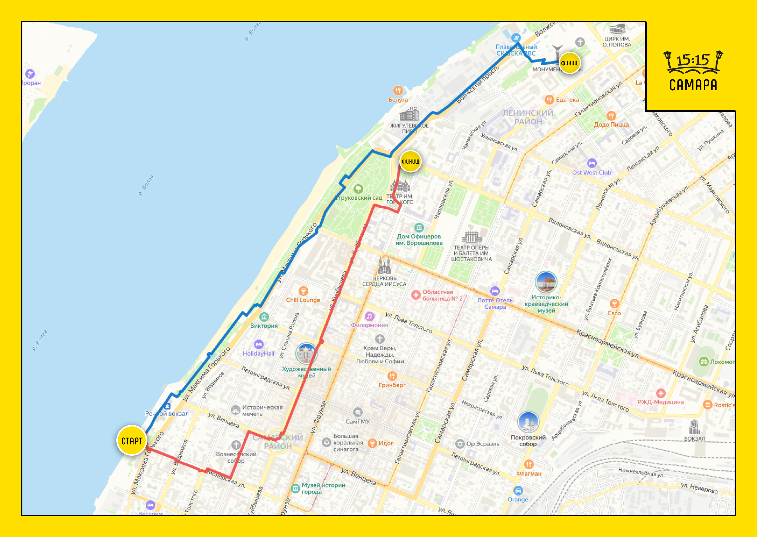 Мы подготовили два насыщенных маршрута по Самаре, которые чередуются через день и включают как визитные карточки города, так и рассказы о его жизни от местного гида. До 1 апреля 2026 года из-за погодных условий гуляем только по красному маршруту.