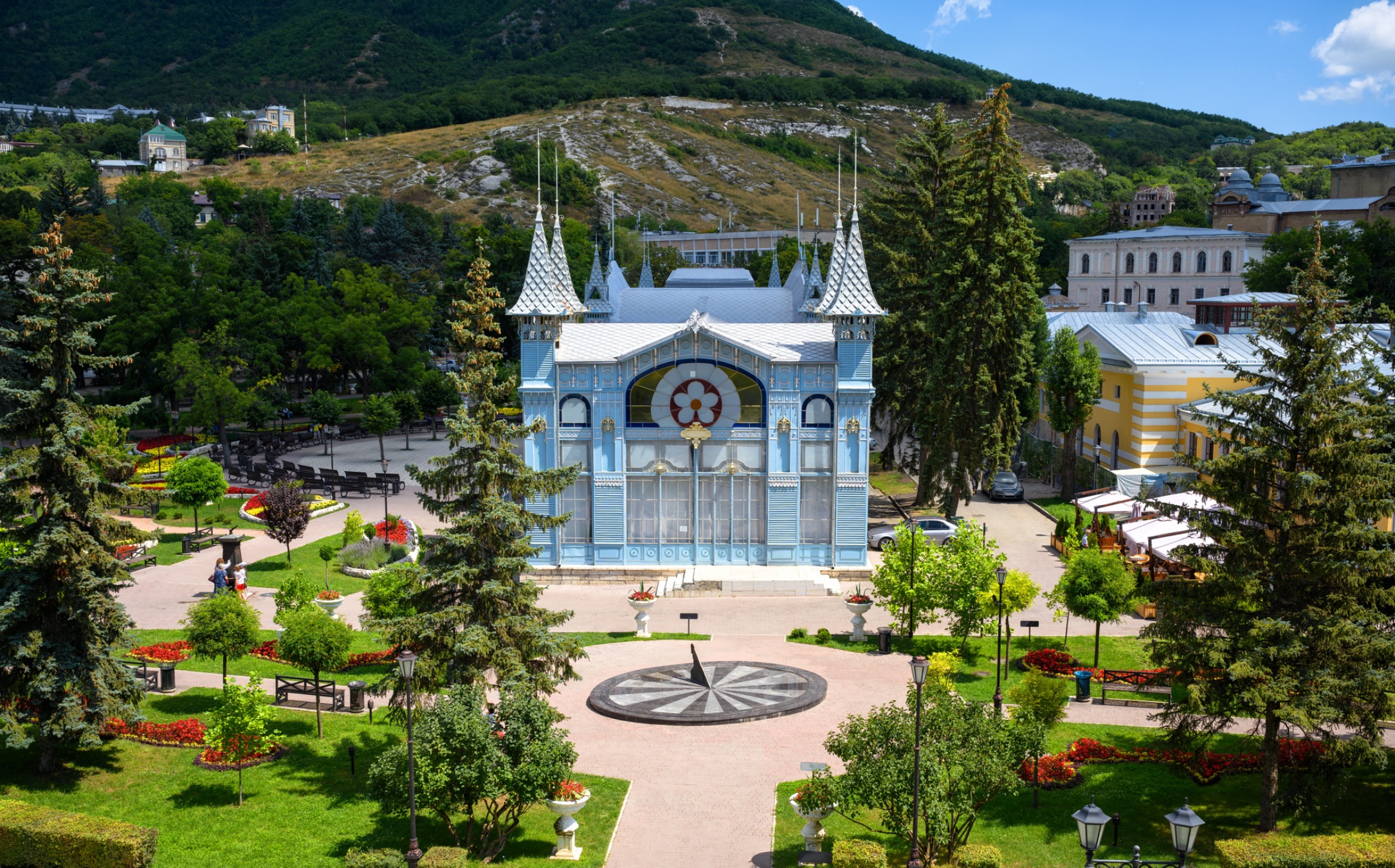 Затем спустимся к парку «Цветник» мимо кофейни Гукасова и здания Ресторации. Подойдём к Лермонтовской галерее и ваннам. А ещё посетим грот Дианы, скульптуру Орла и Китайскую беседку.