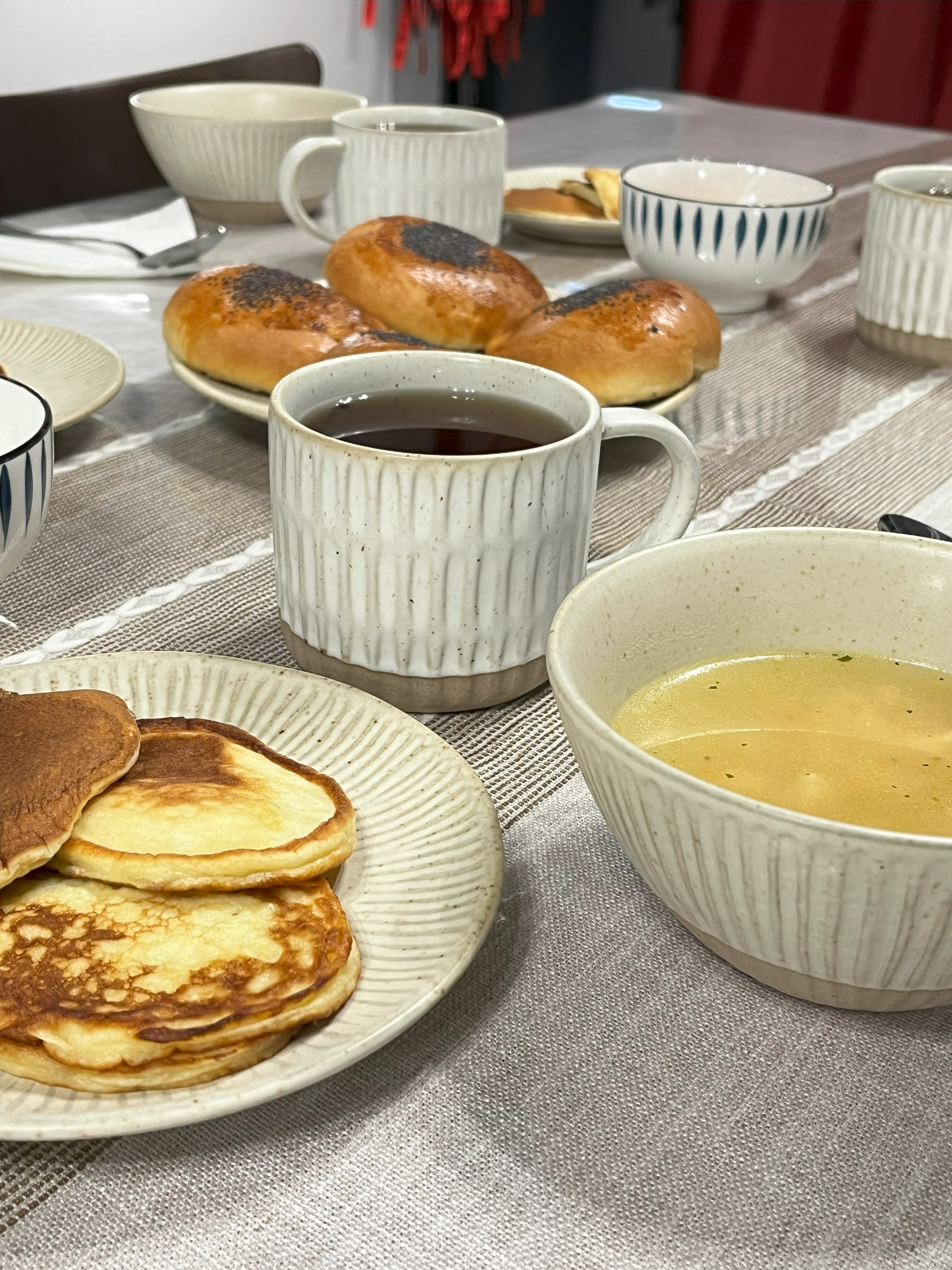 Обед состоит из супа, оладушек со сметаной, пирогов, чая с пряниками. Детям мы раздадим леденцы на палочке.