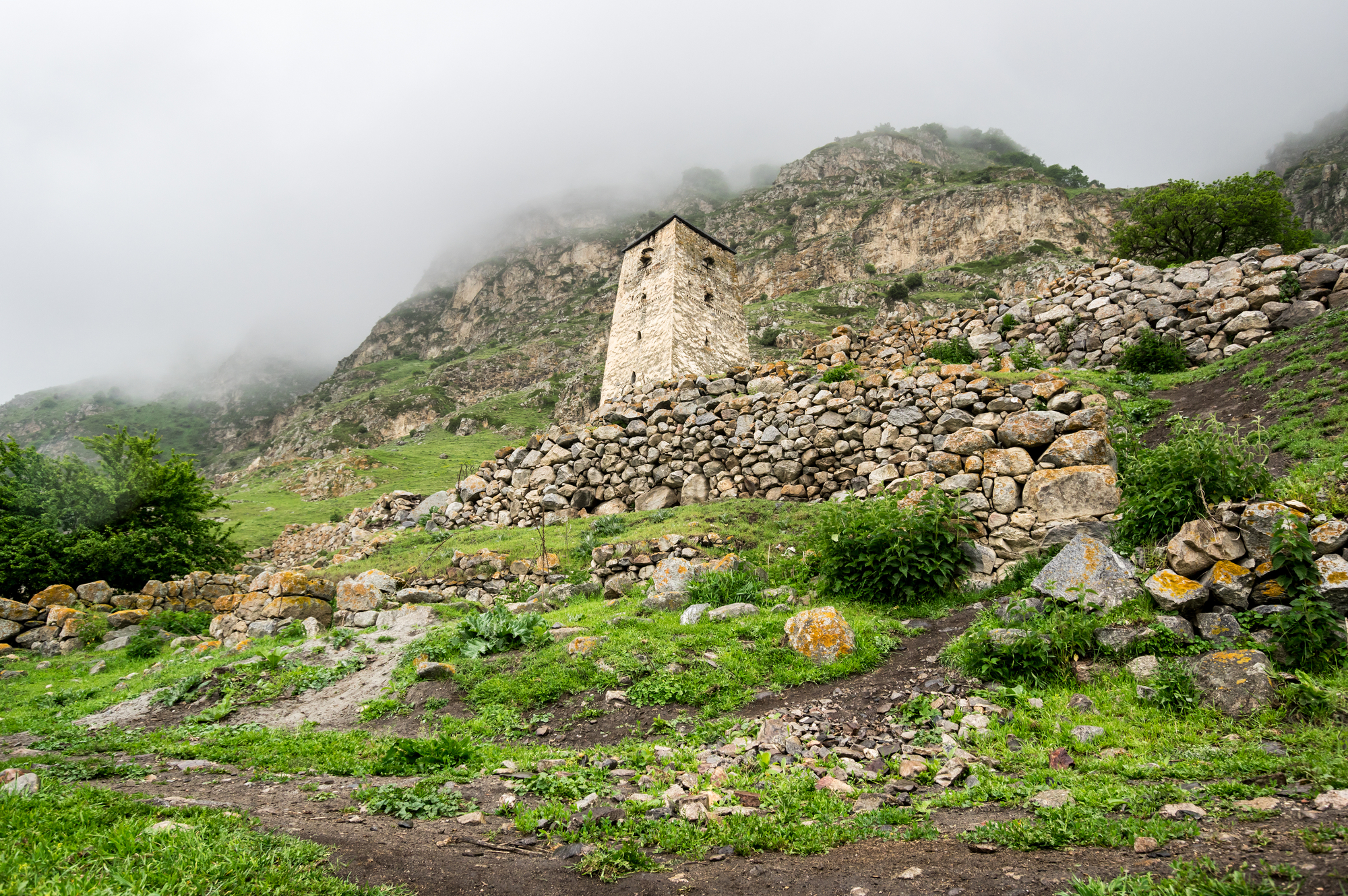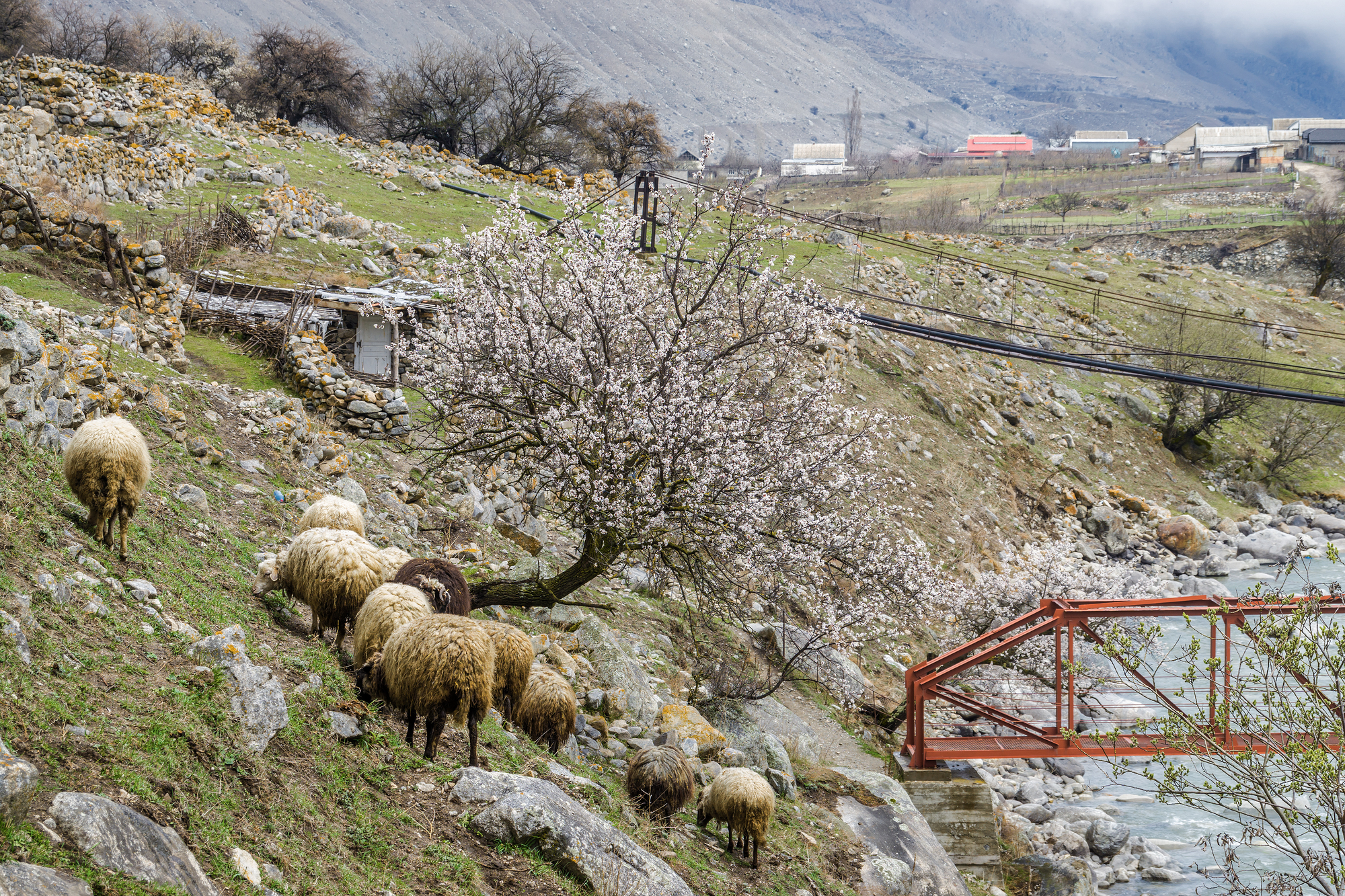 Наша первая локация — старое кабардино-балкарское село и водопад неподалёку. Он не большой, но очень живописный: его поток струится по разноцветному мху. Кроме того, здесь можно попить и набрать с собой воду — она чистейшая и приятная на вкус.