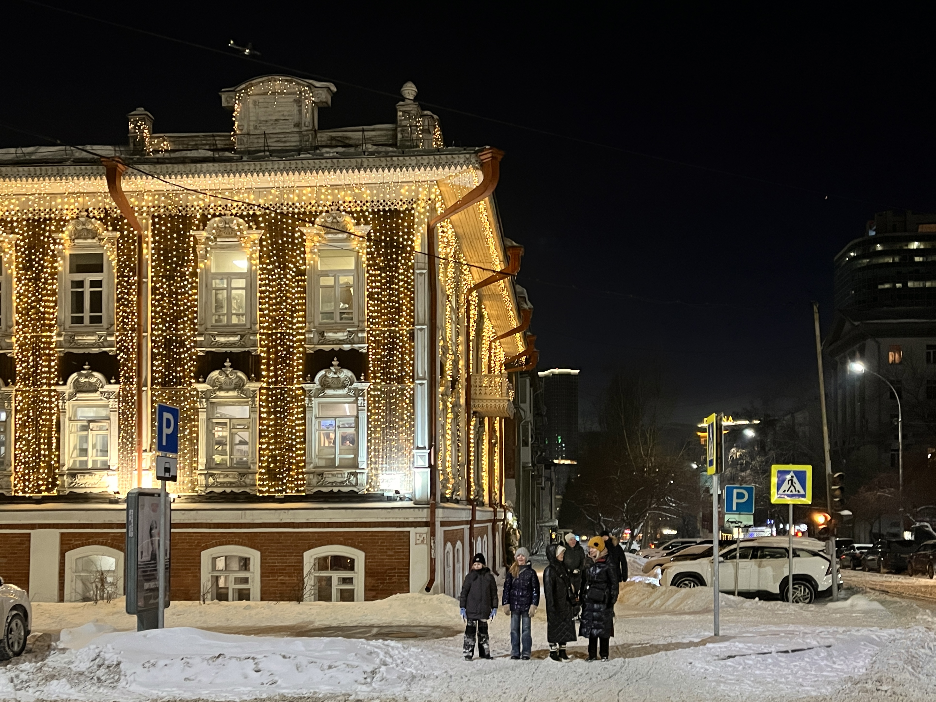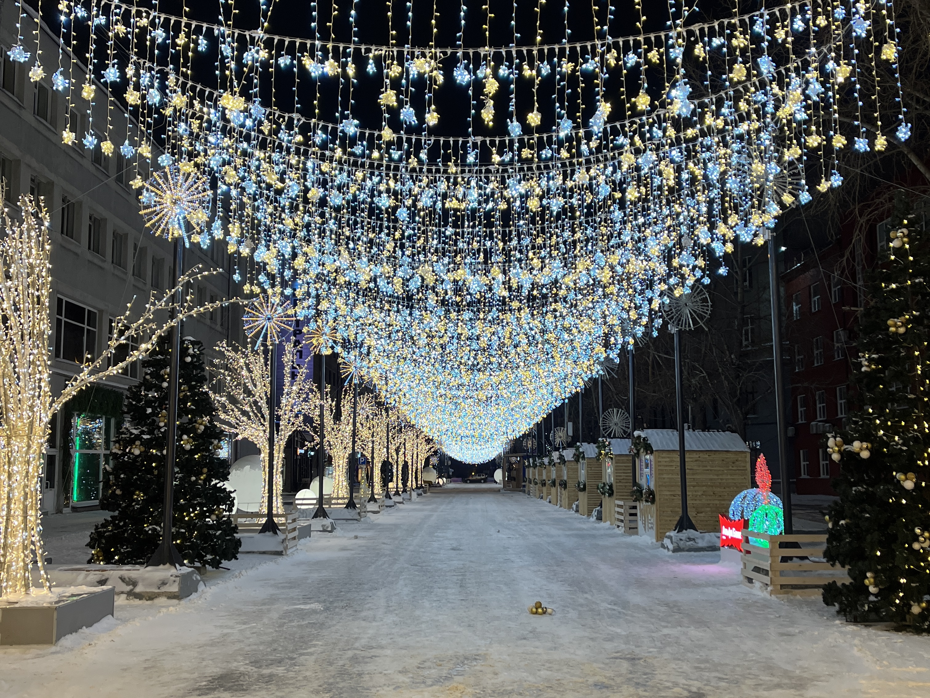 - Уютная аллея с гирляндами (улица Ленина) — путь в Конфитюренбург, страну сладостей, а также к долгожданному подарку